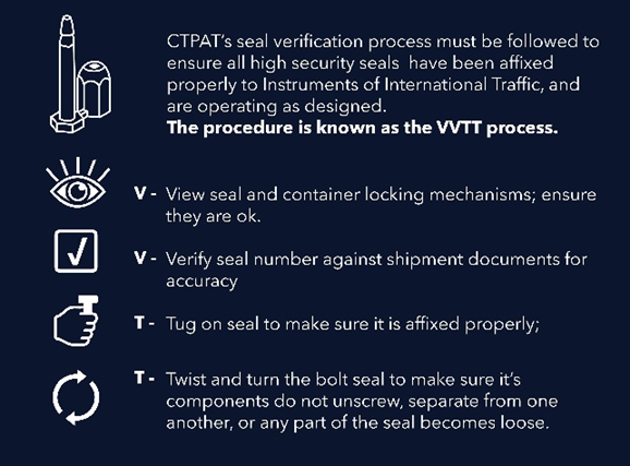 A method used during inspections to confirm seal integrity through View, Verify, Twist, and Tug. This process helps ensure that seals are genuine, properly applied, and have not been compromised during transit. Please see the diagram below for VVTT instructions.